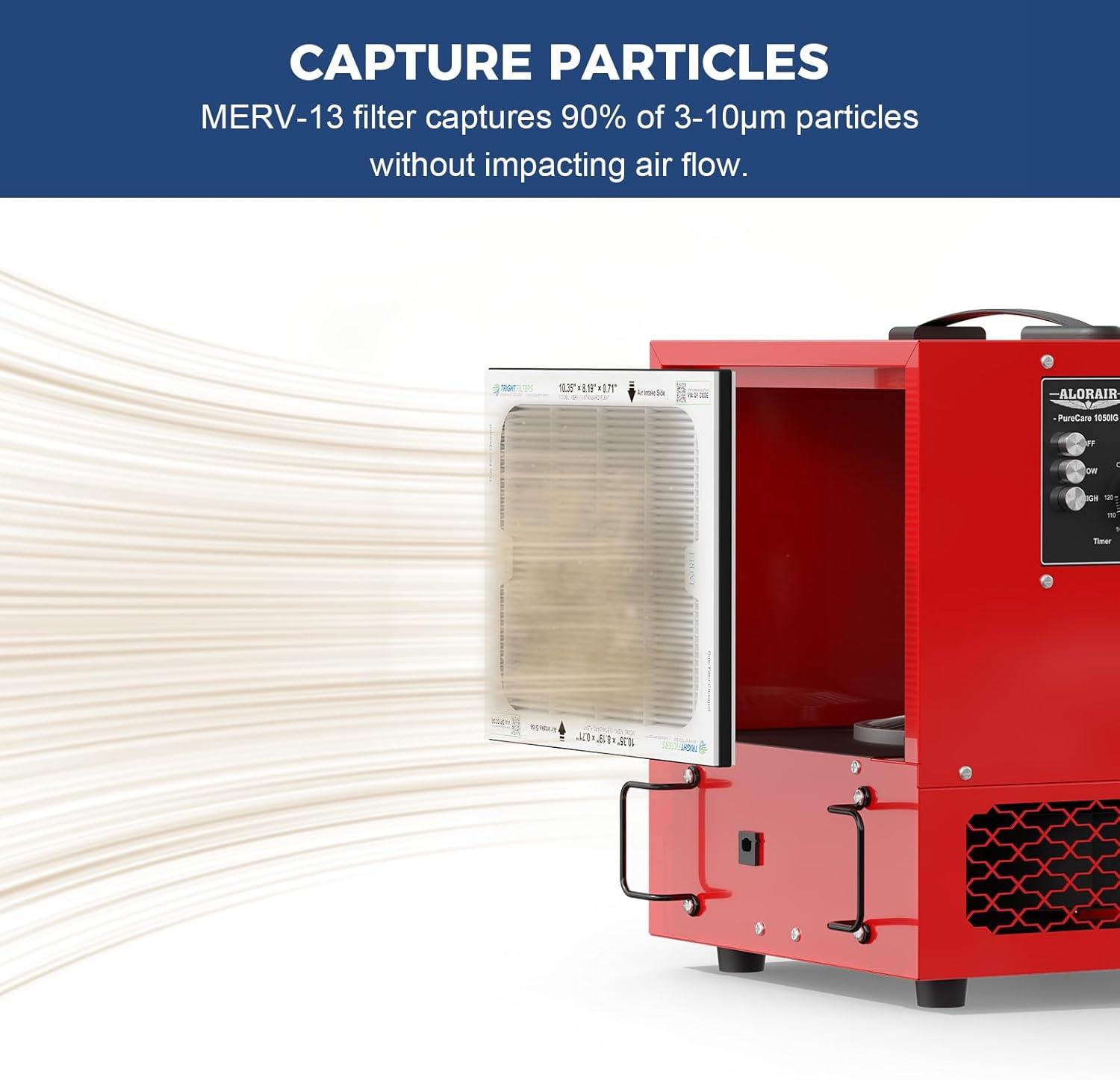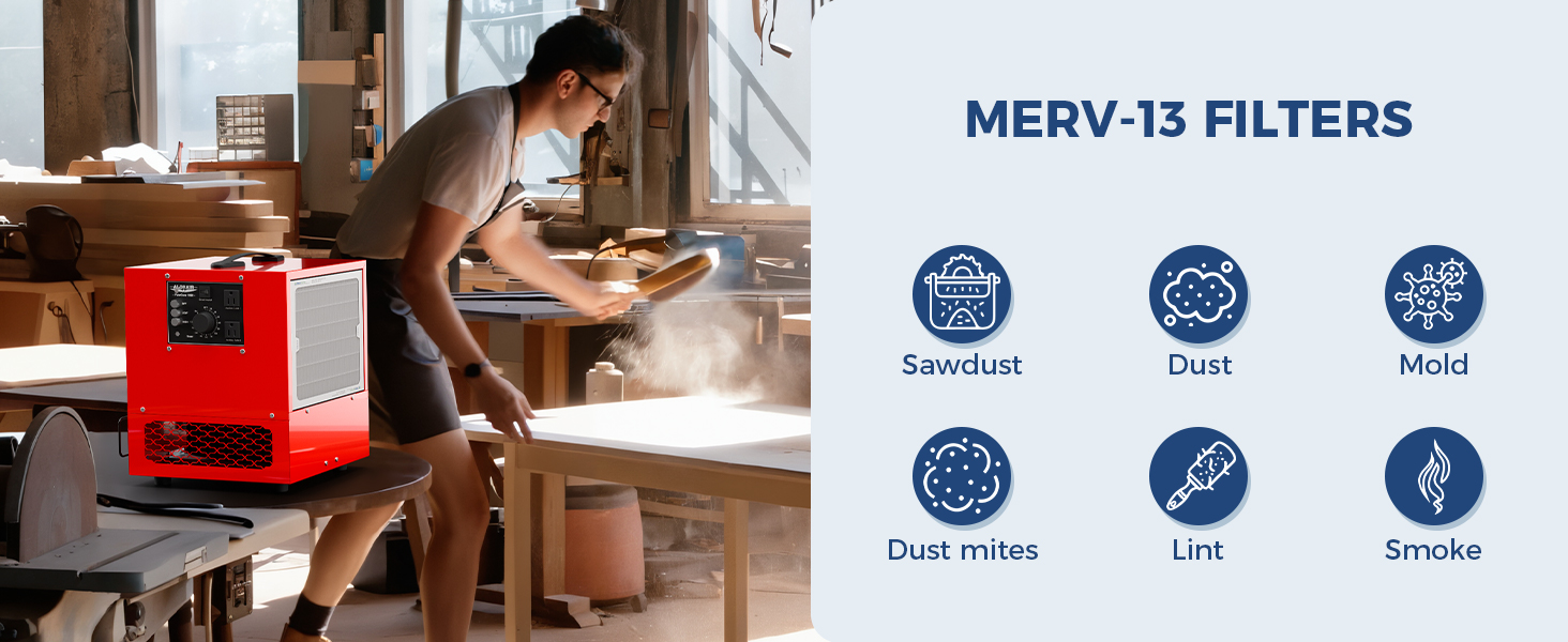 Filtration grade:High efficiency MERV-13 filter captures 90% of 3-10μm particles. Quickly and safely filters airborne particles to protect internal components from clogging while improving your work environment.