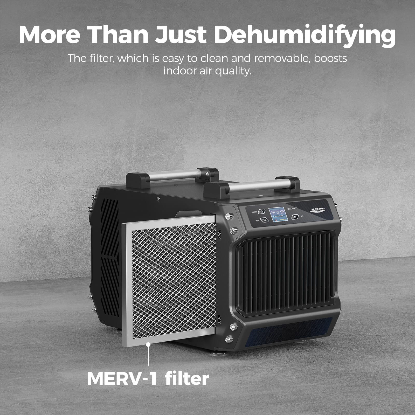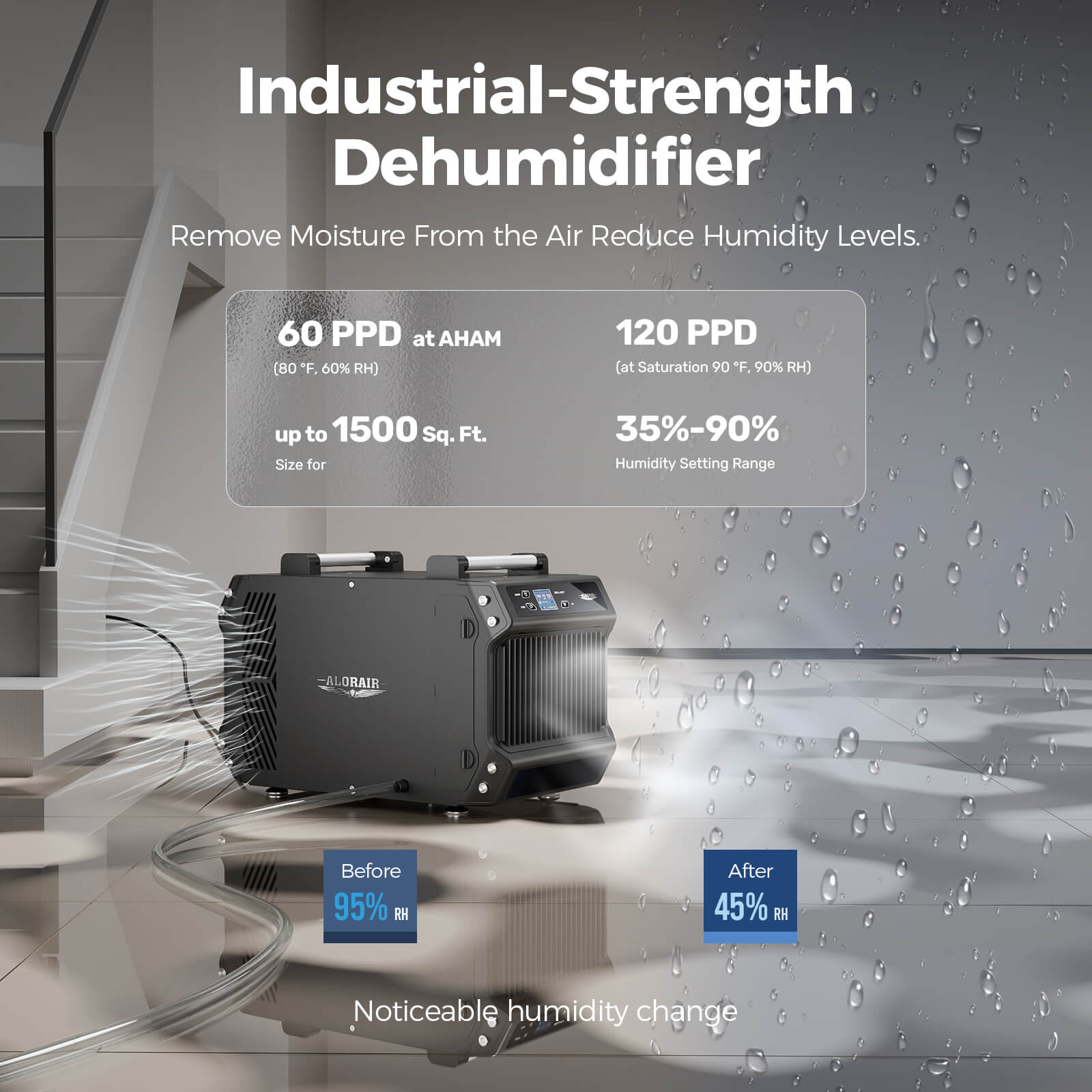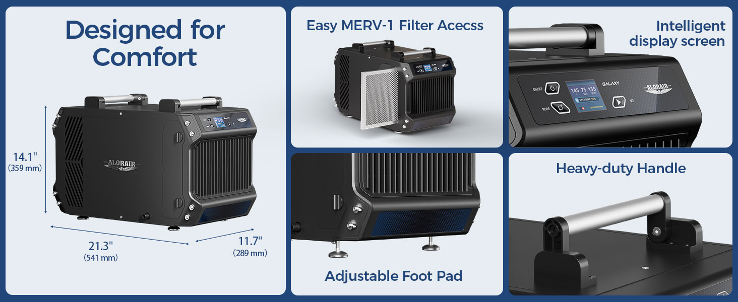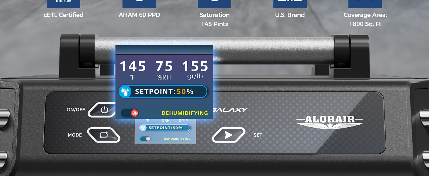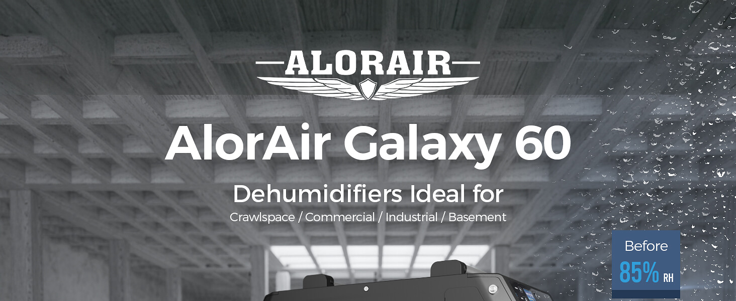 AlorAir Galaxy 60 Removal of 145 PPD at saturation condition, coverage area up to 1,800 sq.ft. It fit for any basement, crawl space, storage area, garage, large room, or commercial use.