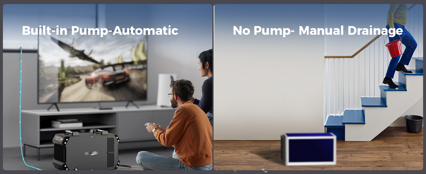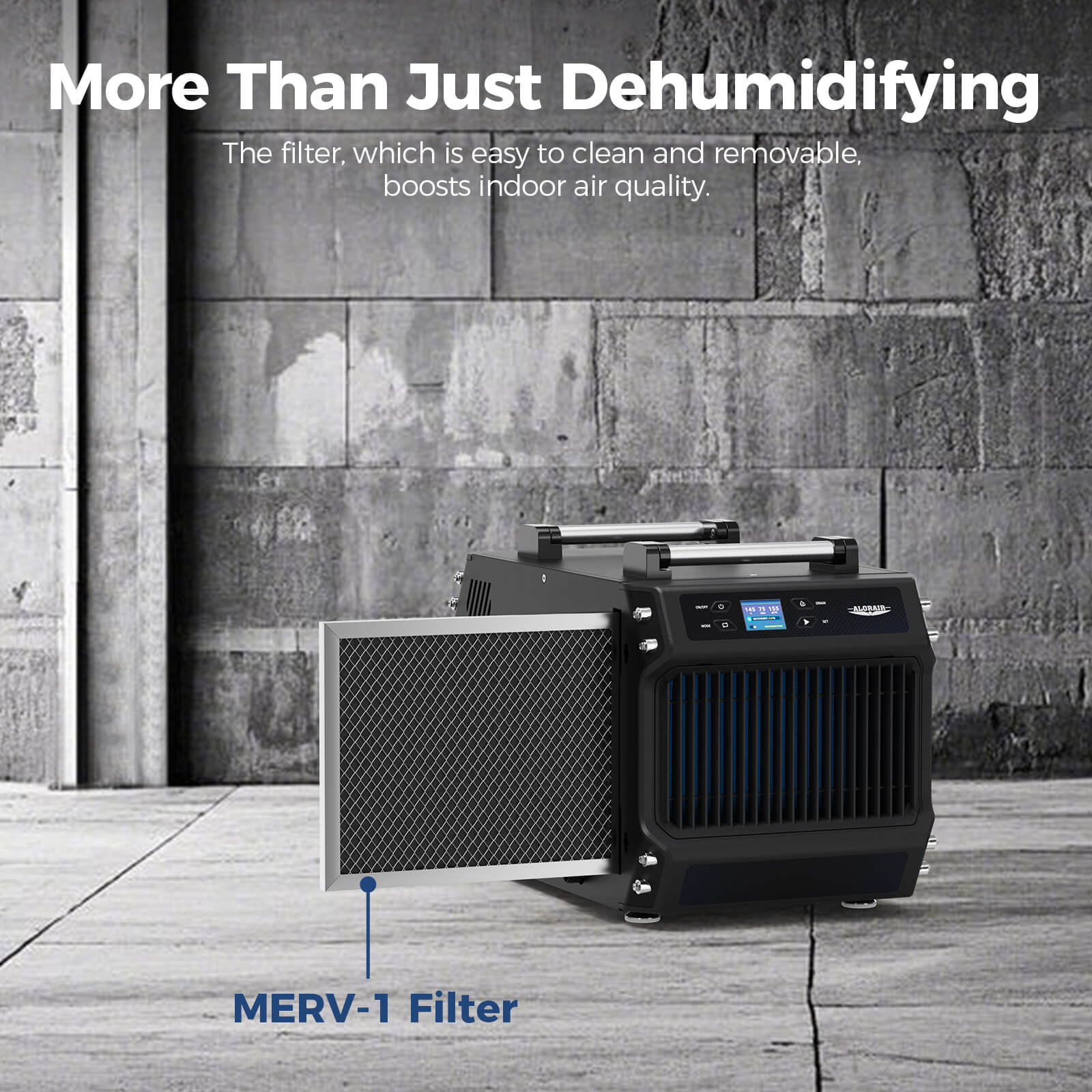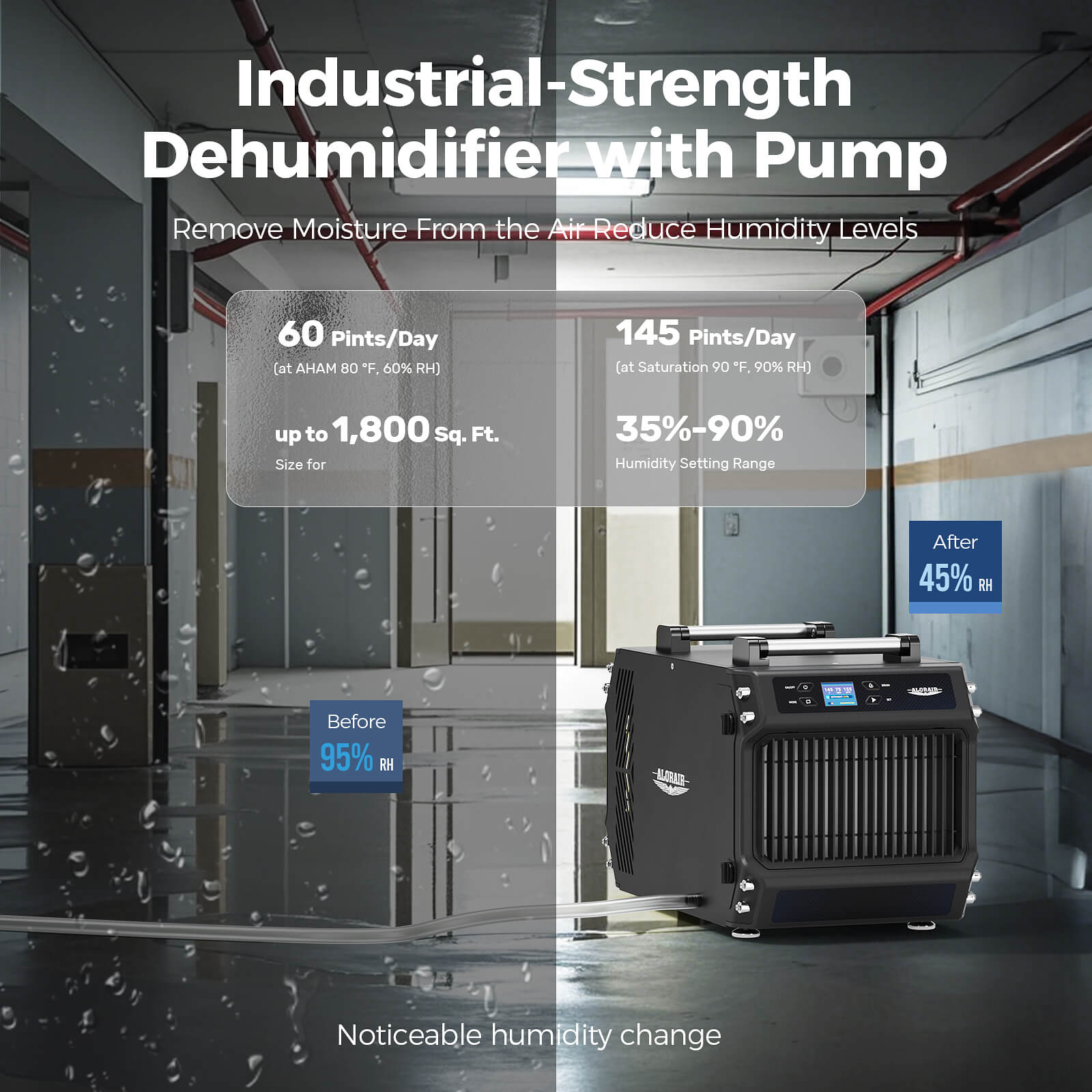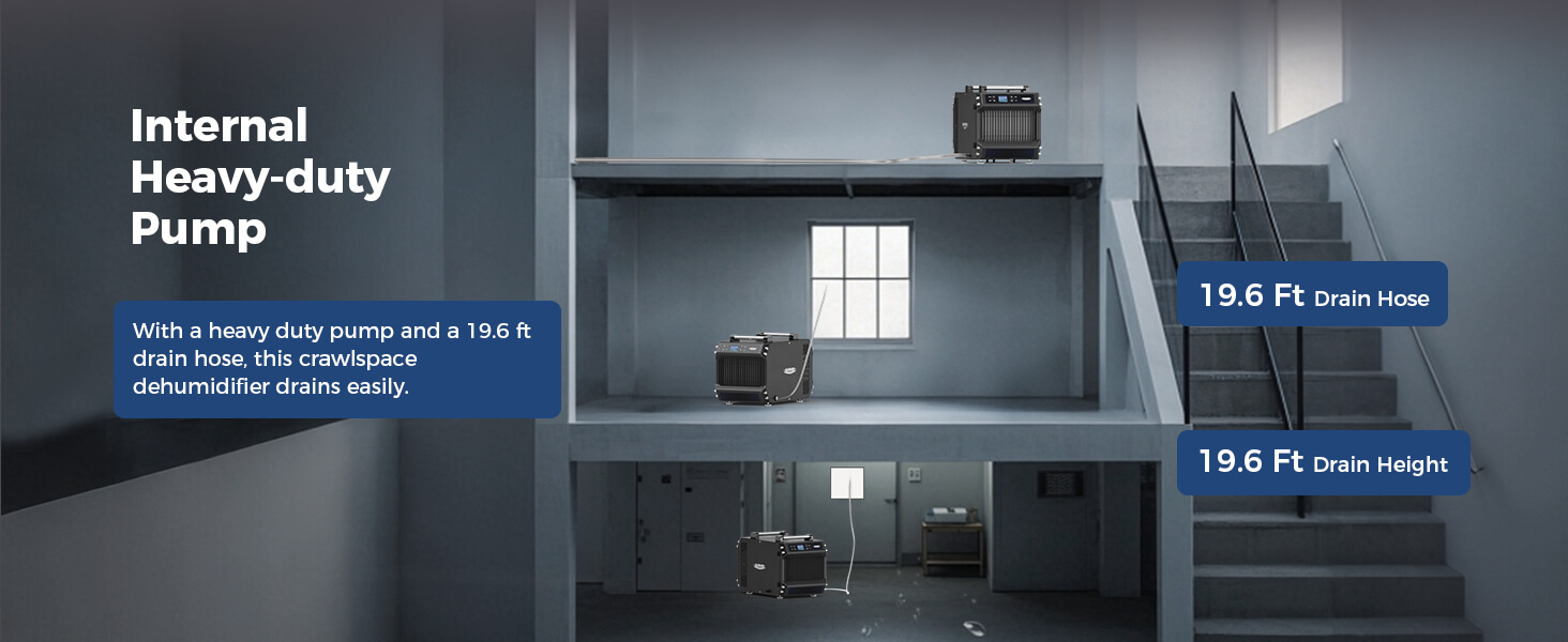 Crawlspace Dehumidifiers with Pump: Removal of 145 PPD at saturation condition, fit for any basement, crawl space, storage area, garage, large room, or commercial use, coverage area up to 1,800 sq.ft, It will be the best crawl space and basement dehumidifier you will ever use