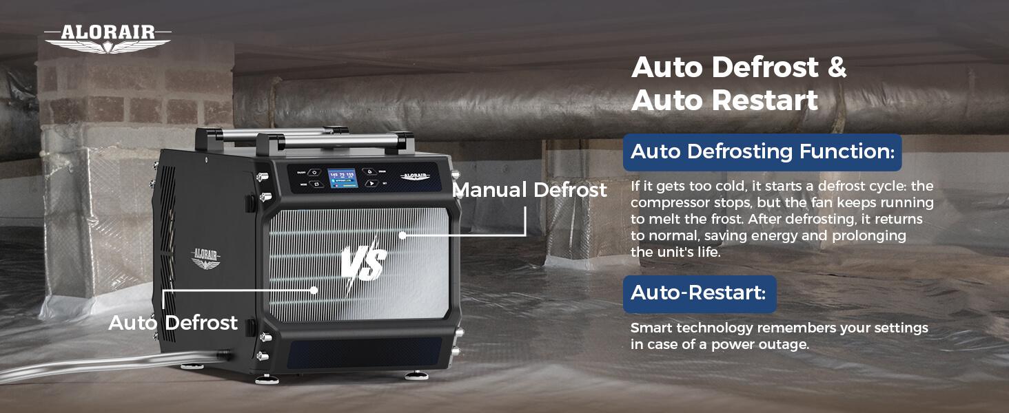 Automatic Defrost: Our advanced auto-defrosting system continuously monitors the ambient temperature using built-in sensors. When the temperature is detected to be low, the unit initiates an automatic defrost cycle to prevent frost buildup and related issues. During this process, the compressor temporarily stops while the fan continues to operate, allowing the frost to thaw. Once the defrost cycle is complete, the dehumidifier resumes normal operation. This feature conserves energy and helps extend the lifespan of the unit