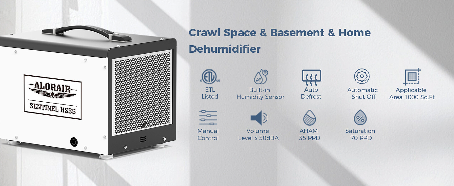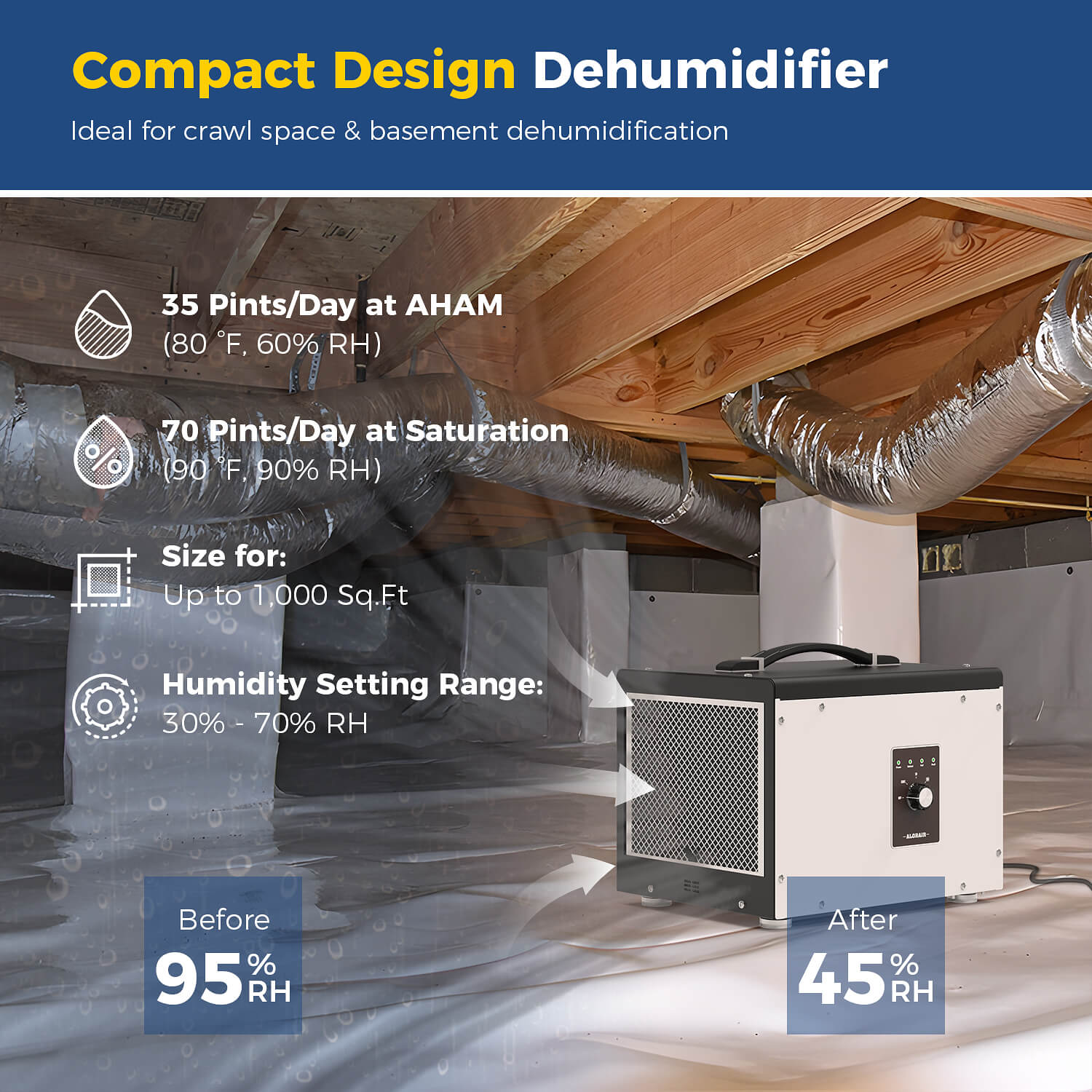 Crawlspace Dehumidifier: The dehumidifier has an air output of 115CFM, removes 35 pints per day in AHAM conditions, 70 Pint at saturation, up to 1,000 sq. ft, fit for any basement, crawl space, bathroom, living room, bedroom, closet and kitchen, meeting the daily needs for dehumidifying